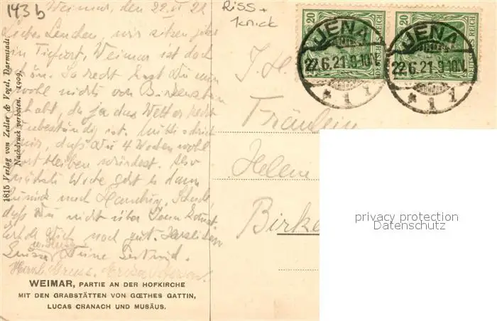 Weimar_Thueringen Hofkirche mit Grabstaetten von Goethes Gattin, Lucas Cranach und Musaeus Weimar Thueringen postalisch gelaufen 1921 Erhaltung siehe scans [LiesaD40] LiesID40