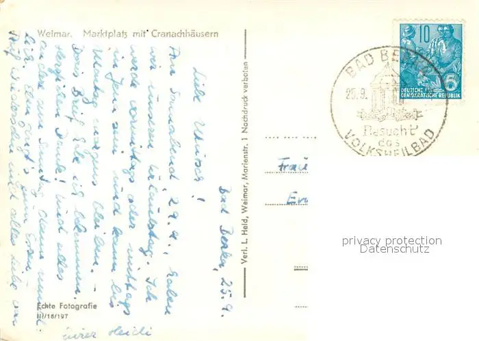 Weimar__Thueringen Marktplatz mit Cranachhaeusern Brunnen postalisch gelaufen 1956 Erhaltung siehe scans [FriedD77] Frierer