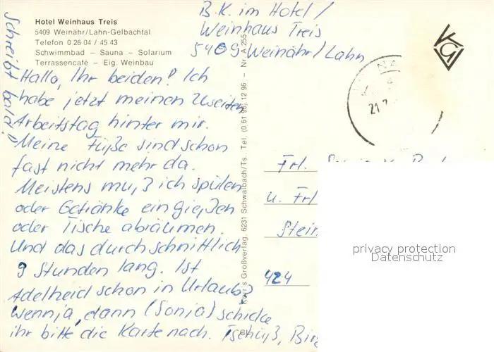Weinaehr Hotel Weinhaus Treis im Gelbachtal Weinaehr postalisch gelaufen nach 1965 Erhaltung siehe scans [FriedD77] Frierer