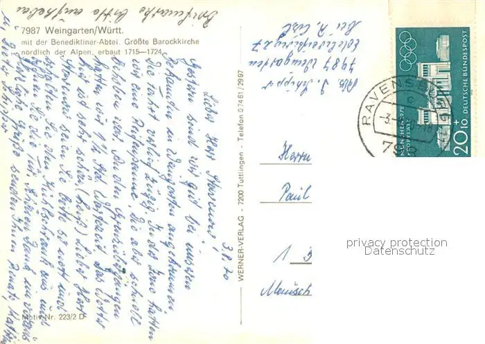 Weingarten_Wuerttemberg Fliegeraufnahme mit Benediktiner Abtei Weingarten Wuerttemberg postalisch gelaufen 1970 Erhaltung siehe scans [LiesaD40] LiesID40