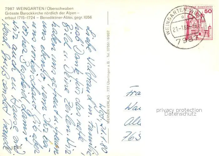 Weingarten_Wuerttemberg Groesste Barockkirche noerdlich der Alpen Benediktiner Abtei Alpenblick Fliegeraufnahme Weingarten Wuerttemberg postalisch gelaufen 1980 Erhaltung siehe scans [FriedD77] Frierer