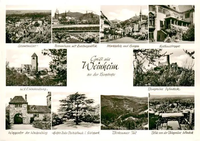 AK / Ansichtskarte Weinheim_Bergstrasse Panorama Marktplatz Burgen Rathaustreppe WSC Wachenburg Burgruine Windeck Wappentor Birkenauer Tal Panorama Weinheim_Bergstrasse