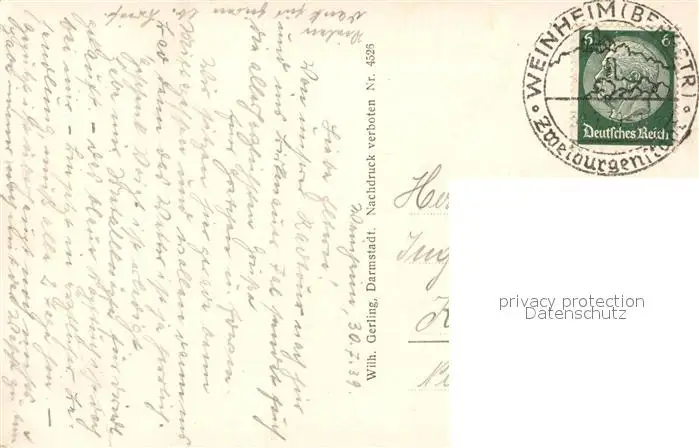 Weinheim_Bergstrasse Stadtpanorama mit Wachenburg und Burg Windeck Weinheim_Bergstrasse postalisch gelaufen 1939 Erhaltung siehe scans [FriedD77] Frierer