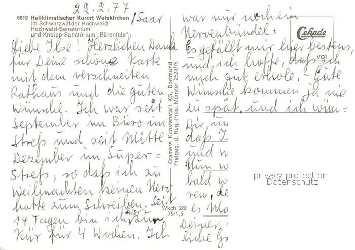 Weiskirchen_Saar Schwarzwaelder Hochwald Sanatorium Baerenfels Weiskirchen Saar postalisch nicht gelaufen 1977 Fliegeraufnahme Erhaltung siehe scans [FriedD77] Fliegeraufnahme Frierer