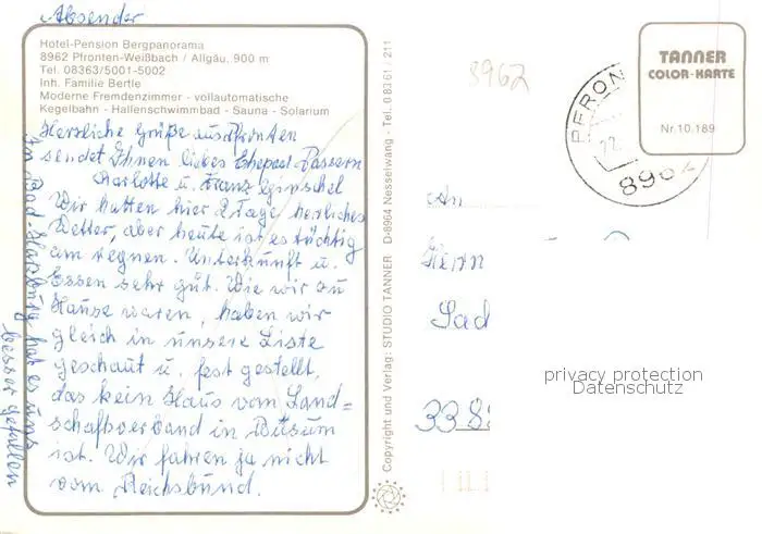 Weissbach_Pfronten Hotel Pension Bergpanorama Restaurant Hallenbad Weissbach Pfronten postalisch gelaufen nach 1965 Erhaltung siehe scans [FriedD77] Frierer
