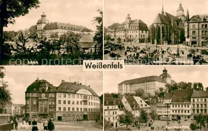 AK / Ansichtskarte Weissenfels_Saale Schloss Rathaus Marienkirche Sparkasse Karl Marx Platz Weissenfels_Saale
