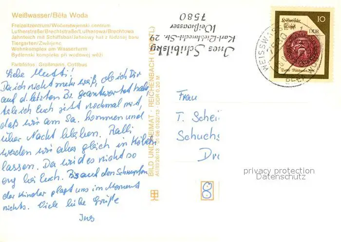 Weisswasser_Oberlausitz Freizeitzentrum Lutherstrasse Brechtstrasse Jahnteich mit Schiffsbar Tiergarten Wohnkomplex am Wasserturm Weisswasser_Oberlausitz postalisch gelaufen nach 1965 Erhaltung siehe scans [WerneD78] WernPID7