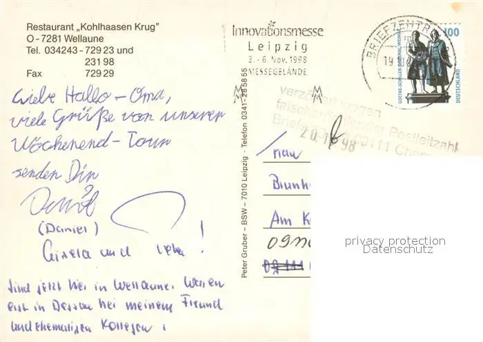 Wellaune_Bad_Dueben Restaurant Kohlhaasen Krug Stadttor Skulptur Statue postalisch gelaufen 1998 Erhaltung siehe scans [FriedD77] Frierer