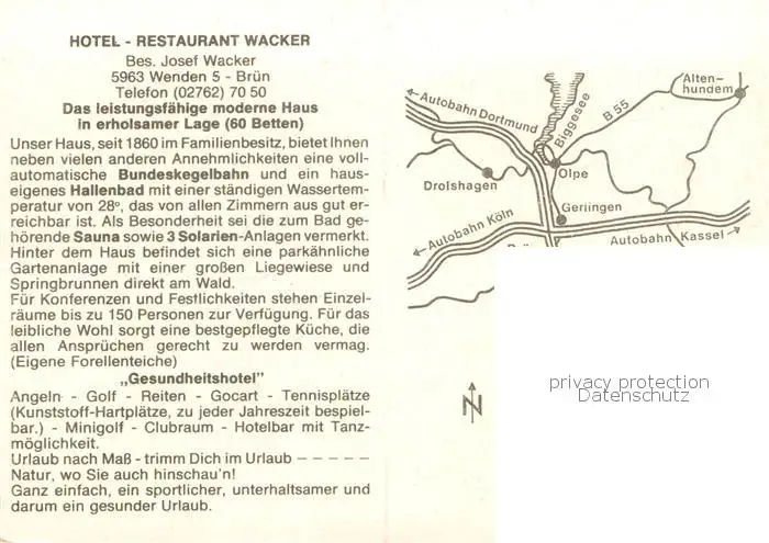 Wenden_Biggetal Fliegeraufnahme Hotel Wacker Teilansicht m. Anfahrt u. Informationen Wenden Biggetal postalisch nicht gelaufen nach 1965 Werbekarte (keine Postkarte) Erhaltung siehe scans [LiesaD40] Werbekarte (keine Postkarte) LiesID40