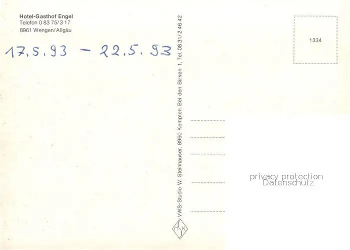 Wengen_Kempten_Allgaeu Hotel Gasthof Engel Wengen_Kempten_Allgaeu postalisch nicht gelaufen 1993 Erhaltung siehe scans [FriedD77] Frierer