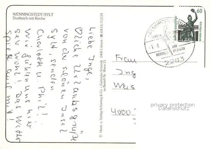 Wenningstedt_Sylt Dorfteich mit Kirche Wasservoegel Wenningstedt_Sylt postalisch gelaufen 1990 Erhaltung siehe scans [FriedD77] Frierer