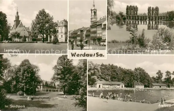 AK / Ansichtskarte Werdau_Sachsen Leninplatz Markt Teiche Stadtpark Freibad Werdau Sachsen