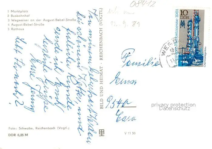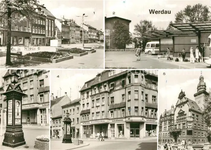 Werdau_Sachsen Marktplatz Busbahnhof Wegweiser August Bebel Strasse Rathaus Werdau Sachsen postalisch gelaufen 1981 Erhaltung siehe scans [FriedD77] Frierer