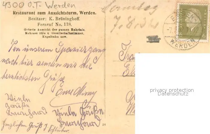Werden_Ruhr_Essen Restaurant Zum Aussichtsturm postalisch gelaufen 1932 Erhaltung siehe scans [LiesaD40] LiesID40