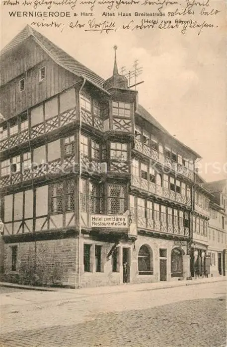 Wernigerode_Harz Altes Haus in der Breitestrasse mit Hotel zum Baeren Wernigerode Harz postalisch gelaufen 1915 Erhaltung siehe scans [WerneD78] WernPID7