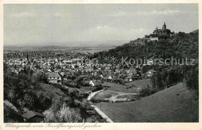 Wernigerode_Harz Blick vom Zwoelfmorgental mit Schloss Wernigerode Harz postalisch gelaufen 1936 Erhaltung siehe scans [WerneD78] WernPID7