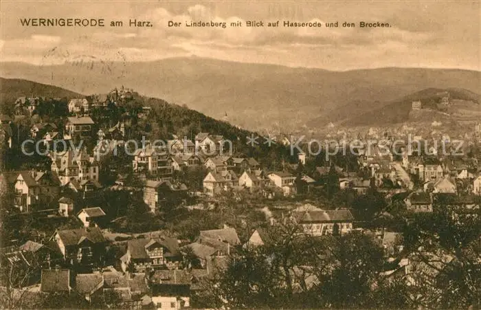 Wernigerode_Harz Lindenberg mit Blick auf Hasserode und dem Brocken Wernigerode Harz postalisch gelaufen 1916 Feldpost Erhaltung siehe scans [FriedD77] Feldpost Frierer