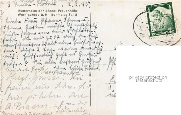 Wernigerode_Harz Muetterheim der Saechsischen Frauenhilfe Wernigerode Harz postalisch gelaufen 1935 Bahnpost Erhaltung siehe scans [FriedD77] Bahnpost Frierer