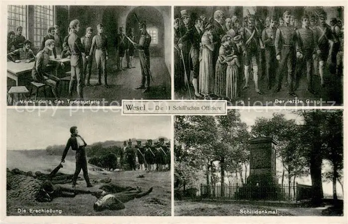 AK / Ansichtskarte Wesel__Rhein Die 11 Schiffschen Offiziere Verkuendung des Todesurteils Der letzte Gang Die Erschiessung Schilldenkmal