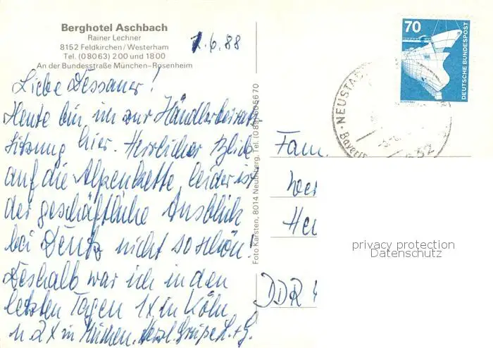 Westerham_Feldkirchen-Westerham Berghotel Aschbach Westerham postalisch gelaufen 1988 Erhaltung siehe scans [WerneD78] WernPID7