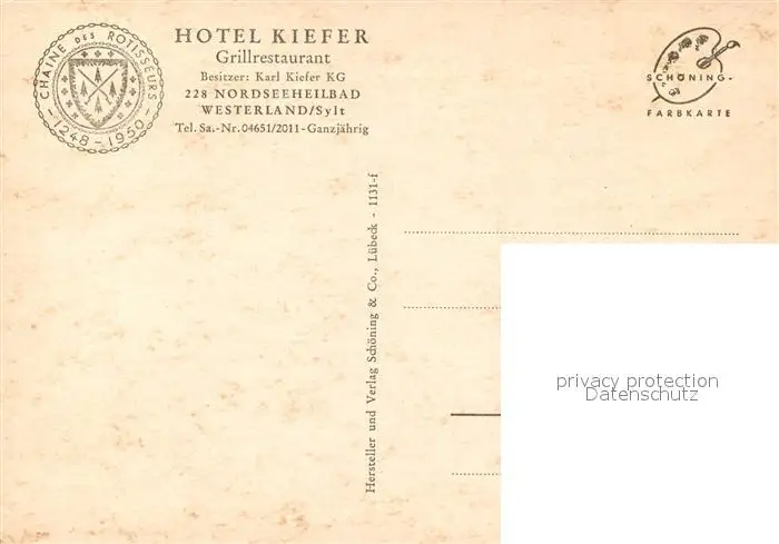 Westerland_Sylt Hotel Kiefer Grillrestaurant Westerland_Sylt postalisch nicht gelaufen nach 1965 Erhaltung siehe scans [FriedD77] Frierer