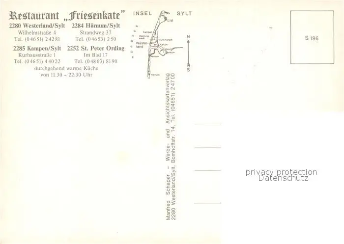 Westerland_Sylt Restaurant Friesenkate Hoernum Kampen und St Peter Ording Westerland_Sylt postalisch nicht gelaufen nach 1965 Erhaltung siehe scans [FriedD77] Frierer