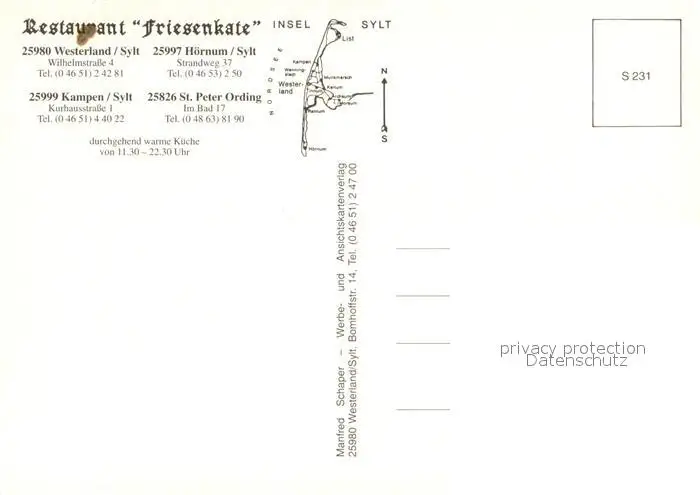 Westerland_Sylt Restaurant Friesenkate Hoernum Kampen und St. Peter Ording Westerland_Sylt postalisch nicht gelaufen nach 1965 Erhaltung siehe scans [FriedD77] Frierer