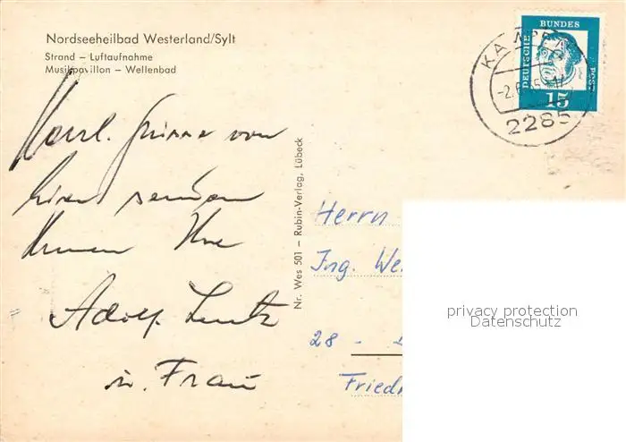Westerland_Sylt Strand Musikpavillon Wellenbad Rettungsring Fliegeraufnahme Westerland_Sylt postalisch gelaufen 1965 Erhaltung siehe scans [FriedD77] Frierer