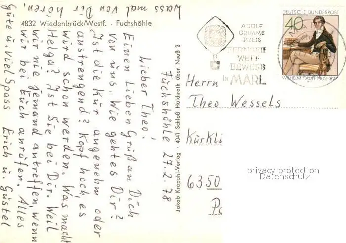 Wiedenbrueck Fuchshoehle Wiedenbrueck postalisch gelaufen 1978 Erhaltung siehe scans [LiesaD40] LiesID40