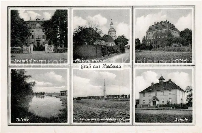 Wiederau_Koenigshain Kategorie Alte Ansichtskarten Postkarten bx82675 Wiederau_Koenigshain Schloss Eingang Pfarrei und Kirche Teiche Funkturm Gross Sender Leipzig Schule postalisch nicht gelaufen Erhaltung siehe scans [WerneD78]