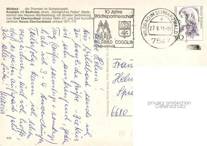 Wildbad_Schwarzwald Kurplatz mit Badhotel Wildbad_Schwarzwald postalisch gelaufen 1991 Erhaltung siehe scans [LiesaD40] LiesID40