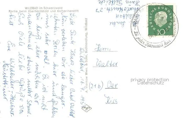 Wildbad_Schwarzwald Partie beim Eberhardsbad und Katharinenstift Wildbad_Schwarzwald postalisch gelaufen 1959 Erhaltung siehe scans [WerneD78] WernPID7