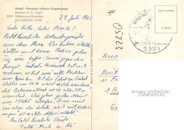 Wildemann Hotel Pension Haus Vogelsang Restaurant Wildemann postalisch gelaufen 1965 Erhaltung siehe scans [FriedD77] Frierer