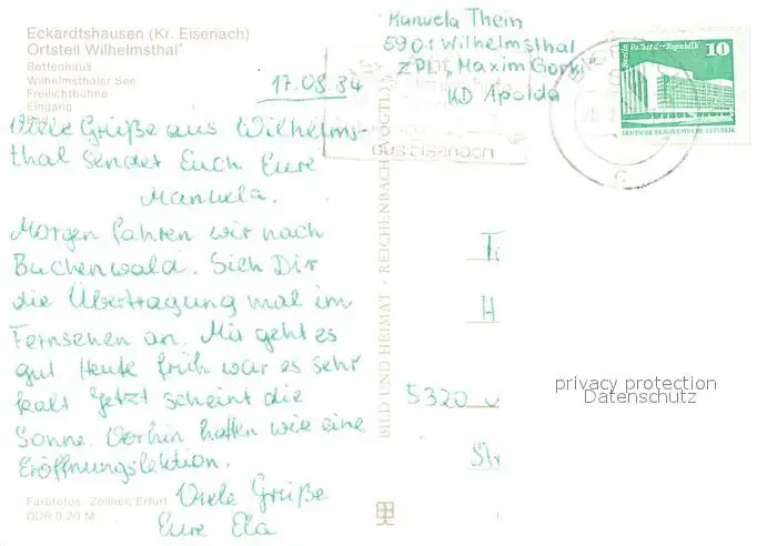 Wilhelmsthal_Eisenach Zentrales Pionierlager Maxim Gorki Bettenahsu See Freilichtbuehne Freibad Wilhelmsthal_Eisenach postalisch gelaufen 1984 Erhaltung siehe scans [FriedD77] Frierer