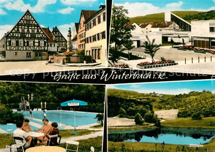 AK / Ansichtskarte Winterbach_Wuerttemberg Marktbrunnen Fachwerkhaus Schule Kirche Stausee Freibad Winterbach Wuerttemberg