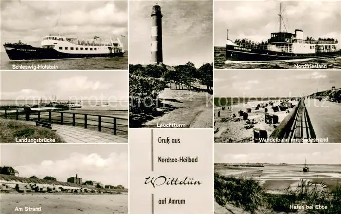 AK / Ansichtskarte Wittduen_Amrum MS Schleswig Holstein Nordfriesland Leuchtturm Landungsbruecke Wandelbahn Badestrand Hafen bei Ebbe Nordseeinsel Wittduen Amrum