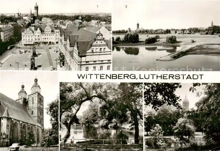 AK / Ansichtskarte Wittenberg__Lutherstadt Marktplatz und Schlosskirche Panorama Stadtkirche Schwanenteich Leninpark