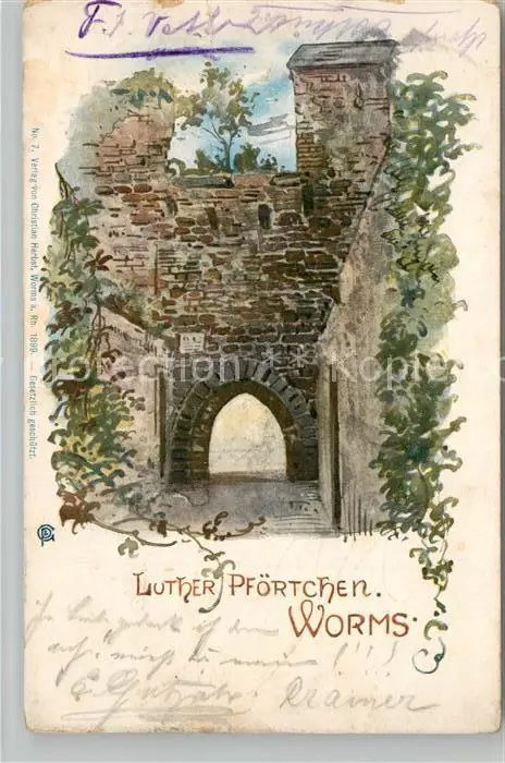 Worms_Rhein Luther Pfoertchen Kuenstlerkarte Worms Rhein postalisch gelaufen 1899 Erhaltung siehe scans [FriedD77] Frierer