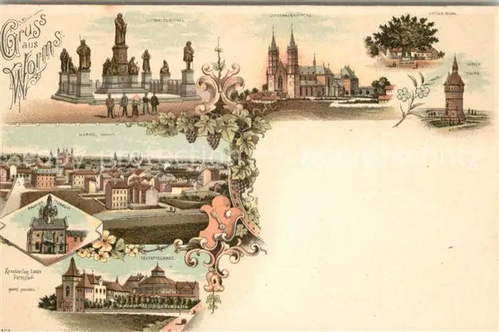 Worms_Rhein Lutherdenkmal Museum Festspielhaus Kirche Wasserturm Litho Deutsche Reichspost Worms Rhein postalisch nicht gelaufen ca. 1900 Erhaltung siehe scans [FriedD77] Frierer