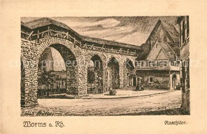 AK / Ansichtskarte Worms_Rhein Raschitor Original Federzeichnung von Rudi Muellers Kuenstlerkarte Worms Rhein