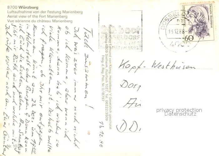 Wuerzburg Fliegeraufnahme Festung Marienberg Wuerzburg postalisch gelaufen 1988 Erhaltung siehe scans [WerneD78] WernPID7