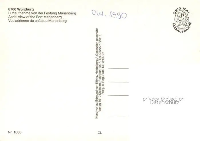 Wuerzburg Fliegeraufnahme Festung Marienberg Wuerzburg postalisch nicht gelaufen nach 1965 Erhaltung siehe scans [LiesaD40] LiesID40