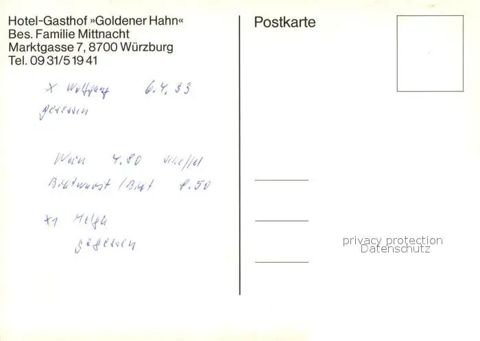Wuerzburg Hotel Gasthof Goldener Hahn Terrasse Gaststube Wuerzburg postalisch nicht gelaufen 1993 Erhaltung siehe scans [WerneD78] WernPID7