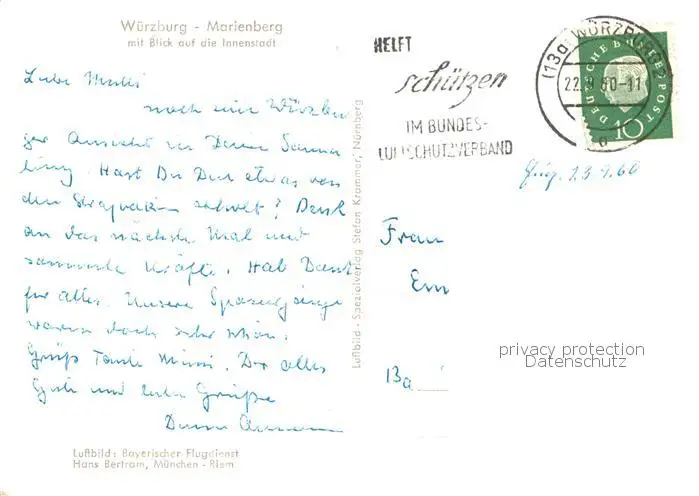 Wuerzburg Marienberg mit Innenstadt Fliegeraufnahme Wuerzburg postalisch gelaufen 1960 Erhaltung siehe scans [WerneD78] WernPID7