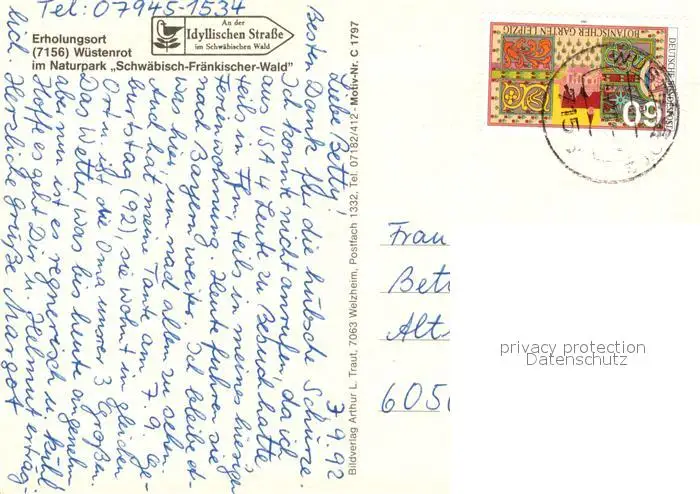 Wuestenrot Freischach Maienfels Steinknickle Rathaus Kreuzle Burgfriedenhalle Wuestenrot postalisch gelaufen 1992 Erhaltung siehe scans [KathaD81] Kathoren