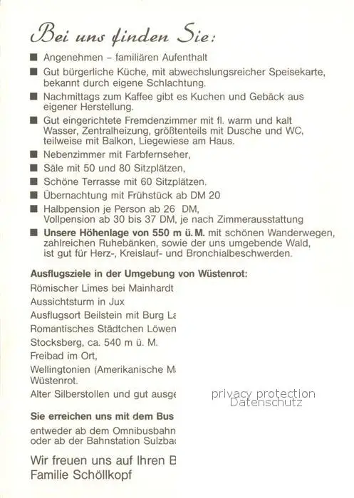 Wuestenrot Pension Schoenblick Gastraum Terrasse Bodenschach Kirche Wuestenrot postalisch nicht gelaufen nach 1965 Werbekarte (keine Postkarte) Erhaltung siehe scans [FriedD77] Werbekarte (keine Postkarte) Frierer