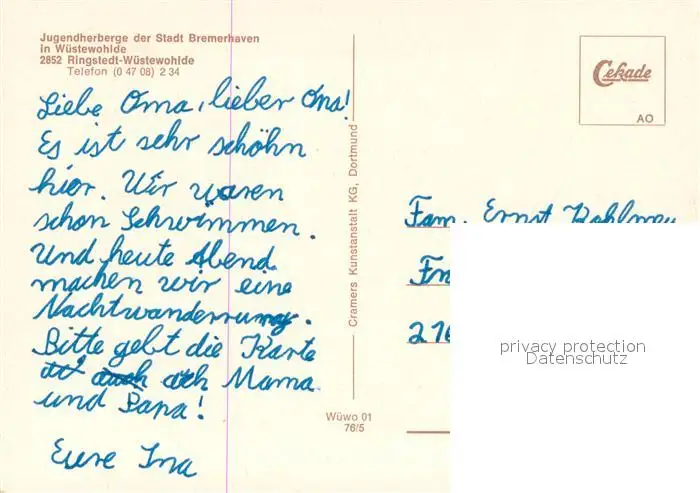 Wuestewohlde Jugendherberge der Stadt Bremerhaven Wuestewohlde postalisch nicht gelaufen 1976 Erhaltung siehe scans [FriedD77] Frierer