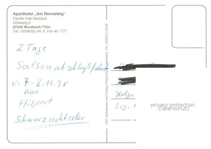 Wurzbach Aparthotel Am Rennsteig Restaurant Hallenbad See Wurzbach postalisch nicht gelaufen 1998 Erhaltung siehe scans [FriedD77] Frierer