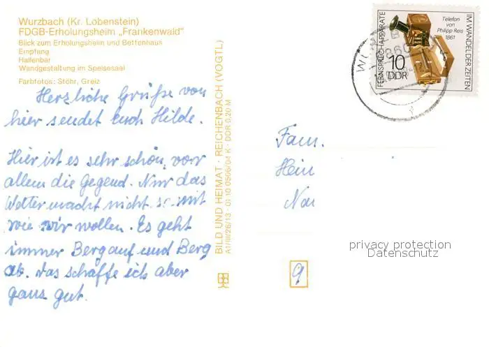 Wurzbach FDGB Erholungsheim Frankenwald Empfang Hallenbar Speisesaal Wurzbach postalisch gelaufen 1989 Erhaltung siehe scans [FriedD77] Frierer