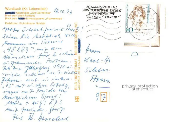 Wurzbach Kategorie Alte Ansichtskarten Postkarten kp09263 Wurzbach Restaurant Zum Sormitztal Wurzbach postalisch gelaufen 1996 Erhaltung siehe scans [LiesaD40]